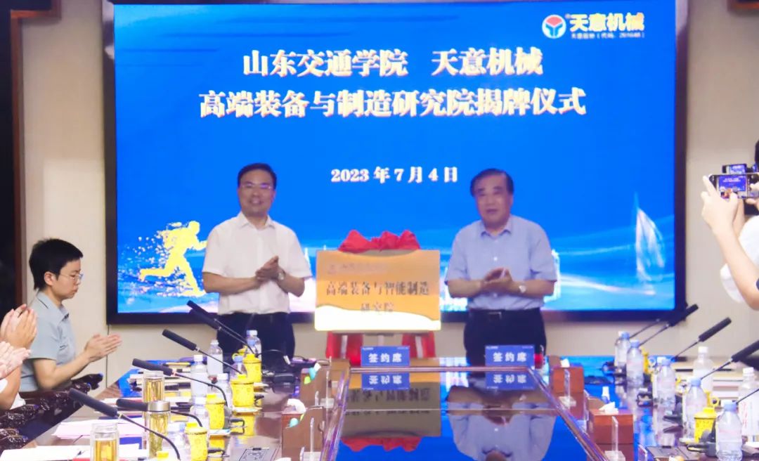 對接會(huì)上,山東交通學(xué)院黨委書記王煥斌與山東天意機(jī)械股份有限公司董事長劉洪彬共同為天意機(jī)械—山東交通學(xué)院高端裝備與智能制造研究院揭牌。