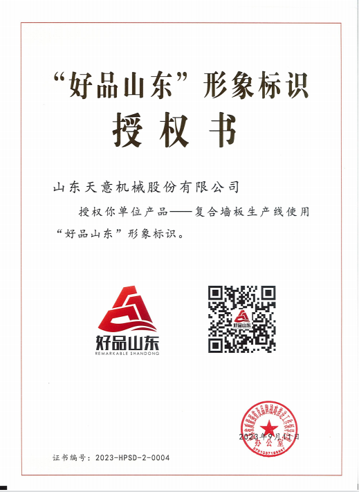 9月12日,由山東省市場監(jiān)管局會同省委宣傳部、省發(fā)展改革委、淄博市政府共同主辦的山東省2023年“質(zhì)量月”啟動儀式在淄博舉行?;顒影l(fā)布第二批“好品山東”品牌遴選名單,共計105個品牌,天意機(jī)械憑借復(fù)合墻板生產(chǎn)線入選“好品山東”品牌遴選名單。