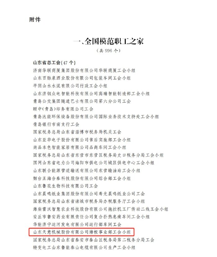 近日,中華全國(guó)總工會(huì)下發(fā)了《關(guān)于表彰全國(guó)模范職工之家全國(guó)模范職工小家全國(guó)優(yōu)秀工會(huì)工作者的決定》,天意機(jī)械墻板事業(yè)部工會(huì)小組獲評(píng)“全國(guó)模范職工小家榮譽(yù)稱號(hào)”。
