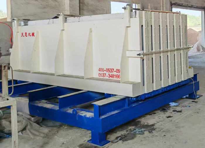 工作原理:模具的開合由下方的液壓機(jī)構(gòu)完成,和墻板機(jī)類似。合模后的鎖緊由上方和兩端的拉桿裝置實(shí)現(xiàn)。下方的強(qiáng)制同步裝置保證了大板在開合時的兩側(cè)同步。大板下方的輪組保證了大板在開合時不傾斜、不倒伏。